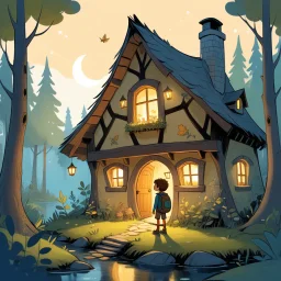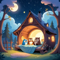 The sun dipped below the horizon, casting a warm, golden glow over a cozy little house nestled at the edge of an enchanted forest. Inside, a child's bedroom was a wonderland of imagination. Stuffed animals crowded the bed, twinkling fairy lights adorned the walls, and a stack of well-loved storybooks stood ready for the night's reading.