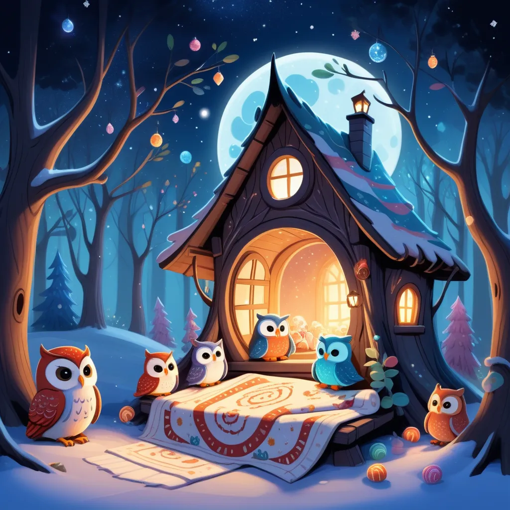 Walking through the candy cane forest, they encountered a wise old owl perched on a sparkling gumdrop tree.