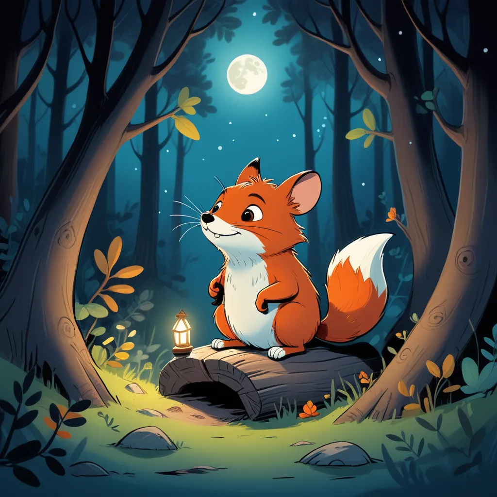 In a deep, dense forest, under the pale silver light of the moon, lay the cozy burrow of a small and clever mouse named Milo. Milo's burrow was filled with little trinkets he had gathered on his adventures—acorns, shiny pebbles, and bits of moss that made his home warm and inviting. Despite the occasional rustle of leaves or the distant hoot of an owl, Milo felt safe.