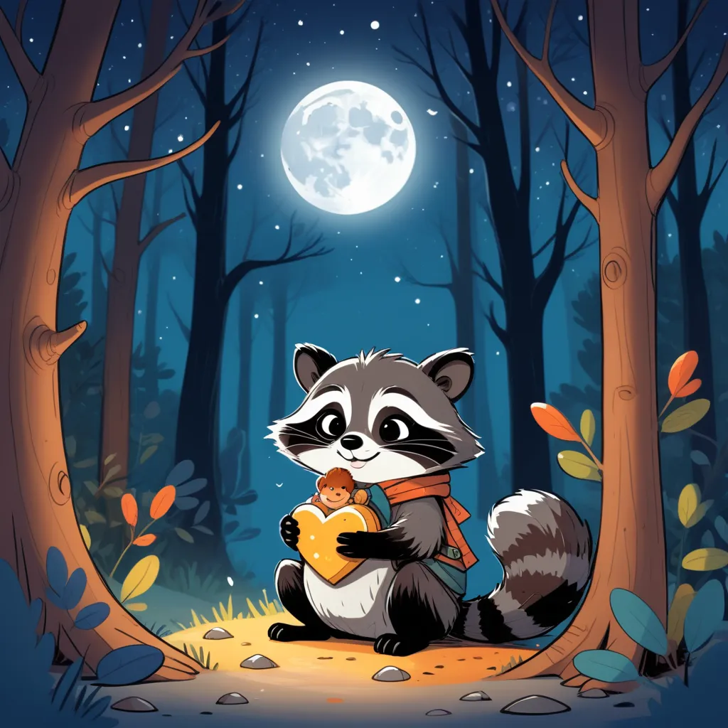 On the edge of a serene and enchanting forest stood a cozy little burrow, with the scent of pine trees wafting gently through the air and a soft, golden light filtering through the leaves. Inside the burrow, Chester the young raccoon was nestled comfortably in his mossy bed, surrounded by his favorite pinecones and shiny pebbles. The night was quiet, but Chester's heart was racing with worry.