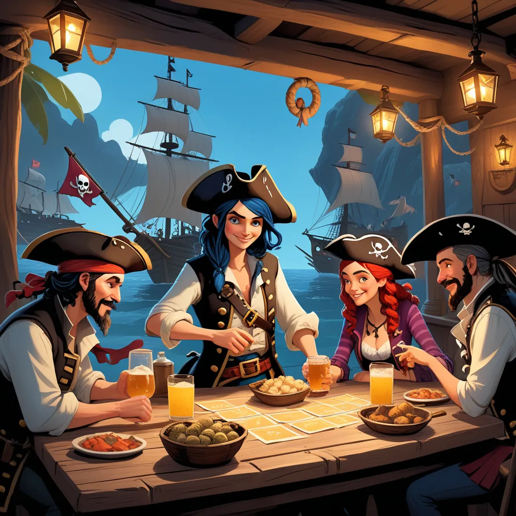 The Rusty Anchor Tavern was buzzing with excitement. Salty Sam, the cheerful and kind-hearted owner, had planned a grand pirate party for the townsfolk of Porthaven. The tavern was decorated with pirate flags, twinkling lanterns, and colorful streamers. Long tables were laden with delicious food, and a lively sea shanty band was tuning up in the corner.