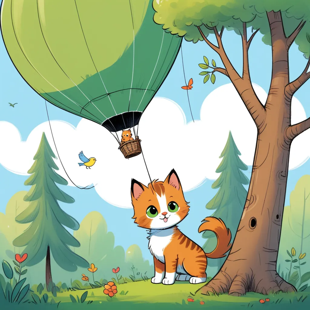 Feeling a bit tired but still determined, the baby bird spotted a massive and colorful hot air balloon drifting down from the sky. Maybe, he thought, his mother was up high where birds love to fly.