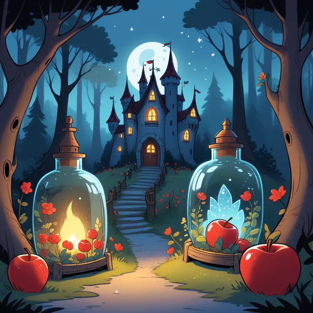 When Snow White answered the door, the disguised Queen offered her an apple. "Take a bite, my dear, it’s delicious." Unaware of the danger, Snow White took a bite and immediately fell into a deep sleep, as if in death itself. The dwarfs found her and, filled with sorrow, placed her in a glass coffin in the forest, surrounded by beautiful flowers and fireflies that glowed like tiny stars.