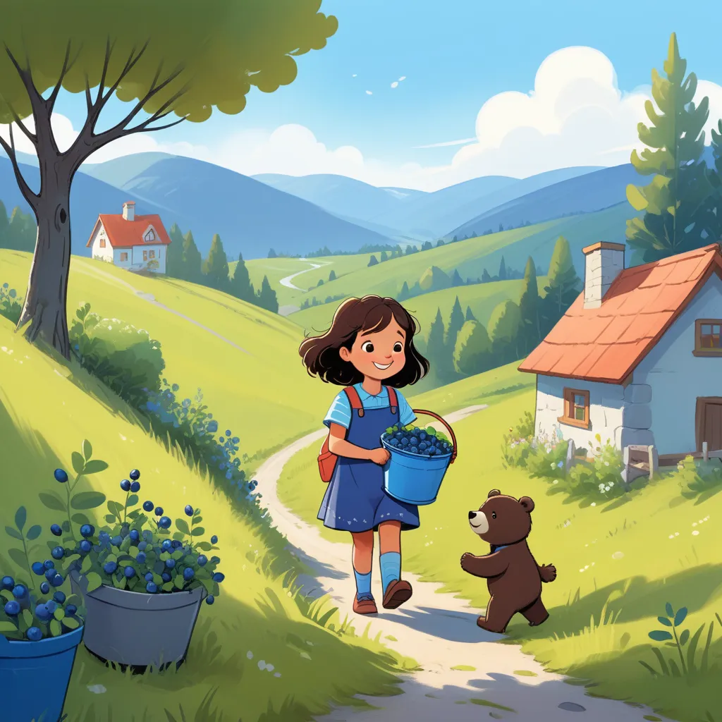 The sun was shining bright over the rolling hills as Little Sal and her mother set off for Blueberry Hill, their favorite spot for picking blueberries. The air was crisp, and the breeze carried the sweet scent of ripening berries. Sal held onto a small tin pail, its insides gleaming, ready to be filled with juicy blue treasures. She wore her favorite hat, slightly too big, which bobbed up and down as she walked. The hill was a cozy, delightful place but held a hint of mystery in the quiet rustling of leaves and occasional bird caws.