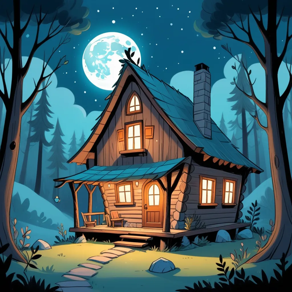 Once upon a time, in a cozy yet slightly eerie woodland clearing, lay a little cabin surrounded by tall trees that whispered secrets with the wind. The cabin belonged to a young bobcat named Benny. His room was filled with fascinating trinkets—a collection of shiny pebbles, pinecones, and old maps he’d found during his adventures.