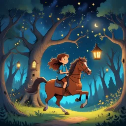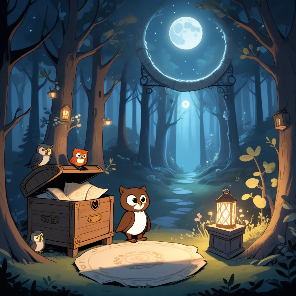 They slipped out into the night, following the glowing map through the garden and into the forest behind Max’s house. The forest was enchanting, with fireflies lighting their path and the cheerful chirps of crickets serenading them. Yet, it was also a bit eerie, with shadows dancing among the trees.