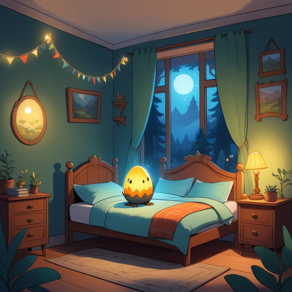 In the heart of a cozy, little bedroom, decorated with twinkling fairy lights and stuffed animals, there stood a curious shelf. On it, strange yet wonderful objects gathered dust: a compass that always spun, a wooden pirate ship with tiny, frozen sailors, and an ancient-looking egg painted in warm, earthy tones. As night fell, the room took on a slight eeriness, trace shadows stretching across the walls, hinting at the stories these objects could tell.
