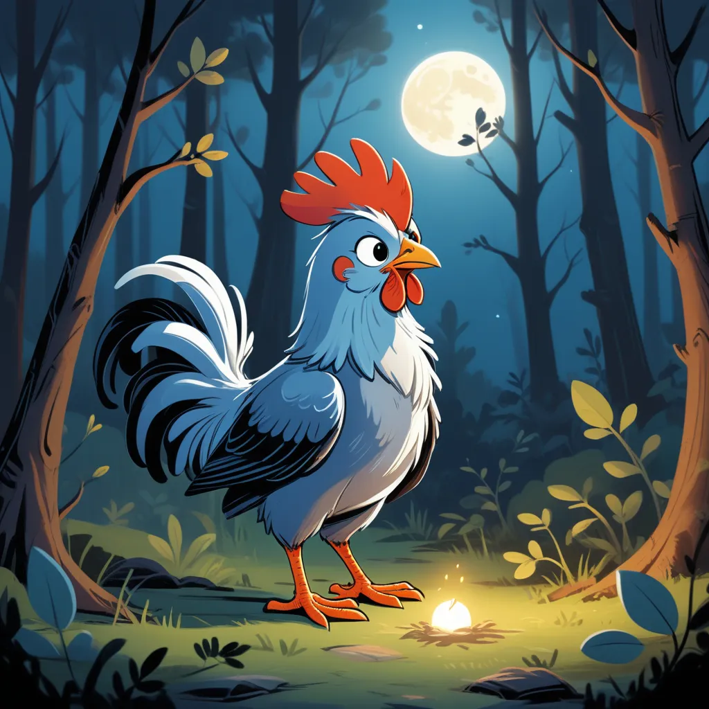 Once upon a time, in a cozy little farm surrounded by dense woods and tall, whispering trees, there lived a brave chicken named Clucky. Clucky's home was a warm and snug chicken coop filled with soft hay, with a little window that let in the silvery moonlight at night. But the woods beyond the farm carried a misty, mysterious air, hinting at secrets waiting to be discovered.
