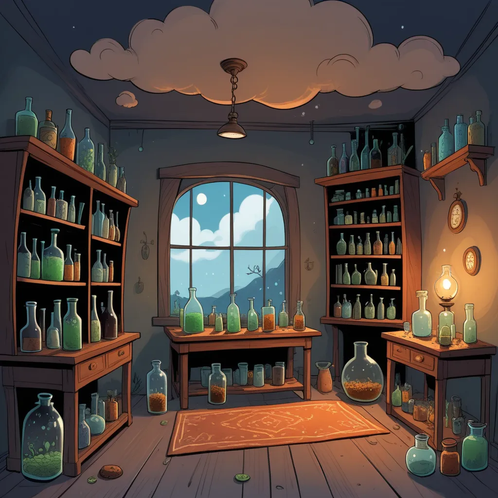 In a cozy yet slightly eerie room filled with all sorts of mysterious bottles and jars, there was a man named John Stith Pemberton. John's workspace was a mix of old books, glass beakers, and strange plants, tucked away in a corner of his home. Outside, the weather was gloomy, with dark clouds hinting at an impending storm. It was the perfect setting for a magical adventure to begin.