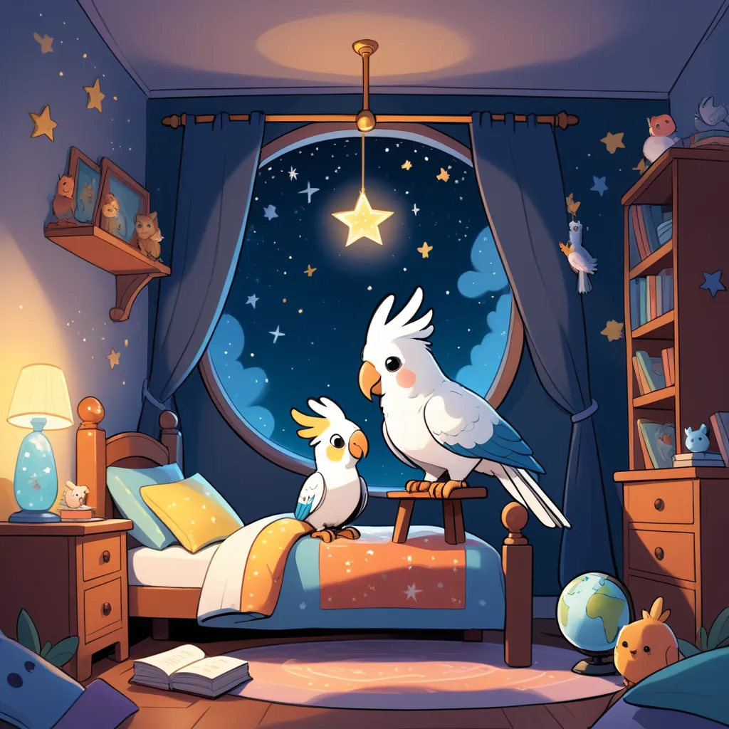 Once upon a time, in a cozy children's bedroom, there lived a curious cockatoo named Percy. The bedroom was filled with fascinating objects: a glowing globe, stuffed animals from every corner of the world, and a telescope that reached the stars. As bedtime crept near, shadows danced on the walls, giving the room a slightly eerie, yet magical feeling.