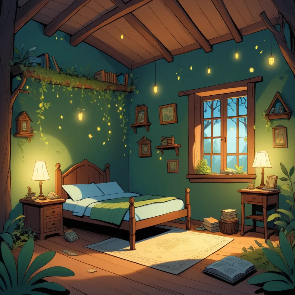 In a snug little town known as Willowshade, there was a cozy bedroom that belonged to a curious boy named Cricket. Cricket's room was unlike any other; it was a treasure trove filled with twinkling globes, ancient maps, and tiny models of ships floating on imaginary seas. The room was softly lit by a lantern that cast playful shadows on the walls, making it feel both magical and a little eerie.