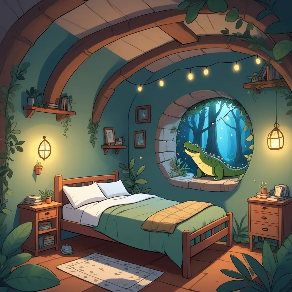In a cozy yet slightly eerie bedroom filled with twinkling fairy lights and shadowy nooks filled with curious objects, a boy named Sam lay wide awake. His room was a treasure trove of adventure gear: a worn-out hat, a dusty telescope, and a large, mysterious map pinned to the wall. Rain gently pattered on the window, creating a calm rhythm that would soon be disrupted.