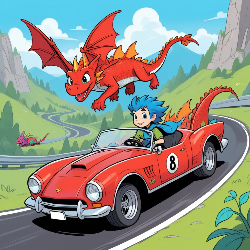 As they lined up at the starting line, their dragon car roared to life. The competition was fierce—dragon racers from all corners of the realm eyed them curiously. Zip waved a checkered flag, signaling the race start.