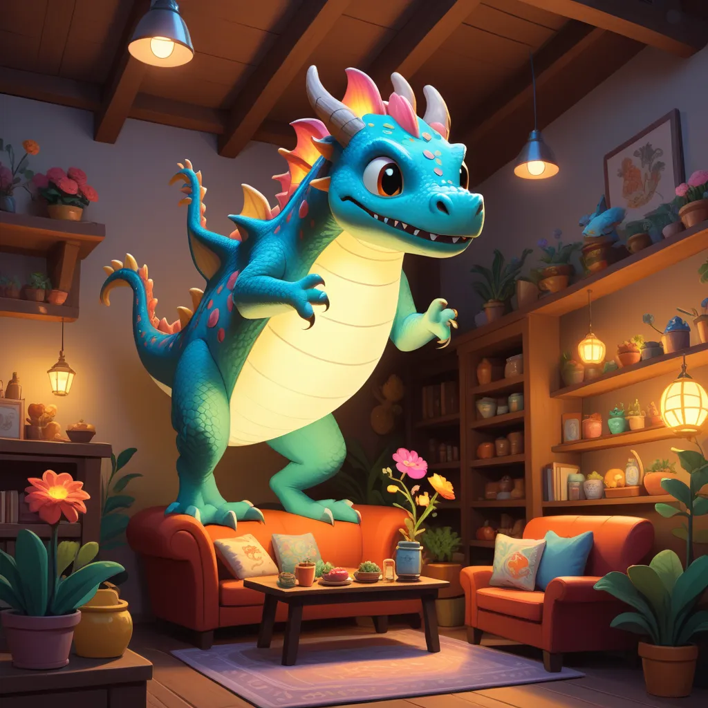 Once upon a time, in a cozy and slightly eerie living room filled with old books and magical trinkets, there lived a boy named Leo who loved dragons. On his nightstand, a colorful dragon lamp cast faint shadows that danced on the walls. The quiet room whispered of hidden adventures and untold secrets.