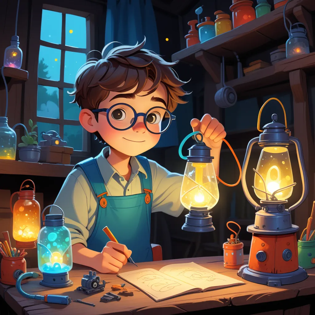 Michael’s workshop was a magical place of wonders—there were shiny metal coils hanging from the ceiling, glass jars filled with colorful liquids on the shelves, and stacks of mysterious books with pages that glowed dimly under the lantern light. The air hummed with the excitement of hidden knowledge waiting to be discovered.