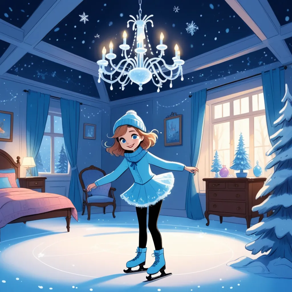 Maria, an adventurous girl with sparkling blue eyes, was about to crawl into bed when she heard a strange noise—a faint tinkling sound like tiny bells echoing from outside. Curious and a bit puzzled, she tiptoed to the window and peeked out. Her eyes widened in amazement as she saw a glimmering path of ice that led away from her house and into the nearby forest, which had transformed into a magical ice rink under the moon’s silver beams.
