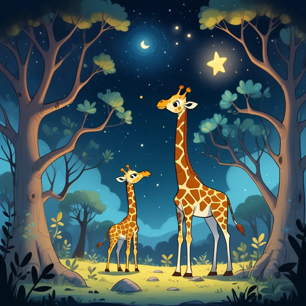 In a cozy, slightly eerie forest where tall trees rustled with secrets and shadows danced under the soft glow of the moon, lived a young giraffe named Gemma. Gemma’s home was a dreamy blend of leaf-filled wonder and a touch of mystery. Her favorite spot was her cozy nest-like nook at the top of an ancient baobab tree, filled with small treasures she had collected—glowing stones, shiny leaves, and even a mysterious, old compass.