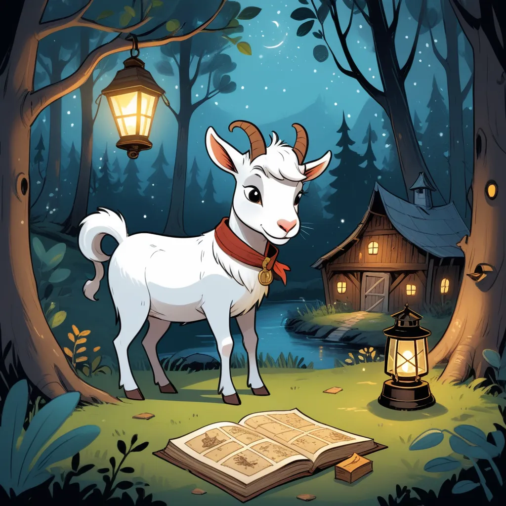 Once upon a time, in a cozy little barn perched on the edge of a mysterious forest, lived a small white goat named Gracie. Gracie's barn was filled with all sorts of intriguing objects: an old clock that never ticked, dusty books with yellowing pages, and a vintage pirate map nailed to the wooden wall. As the sun slipped below the horizon, casting long shadows, the barn transformed from cozy to slightly eerie, a place where magic seemed almost possible.