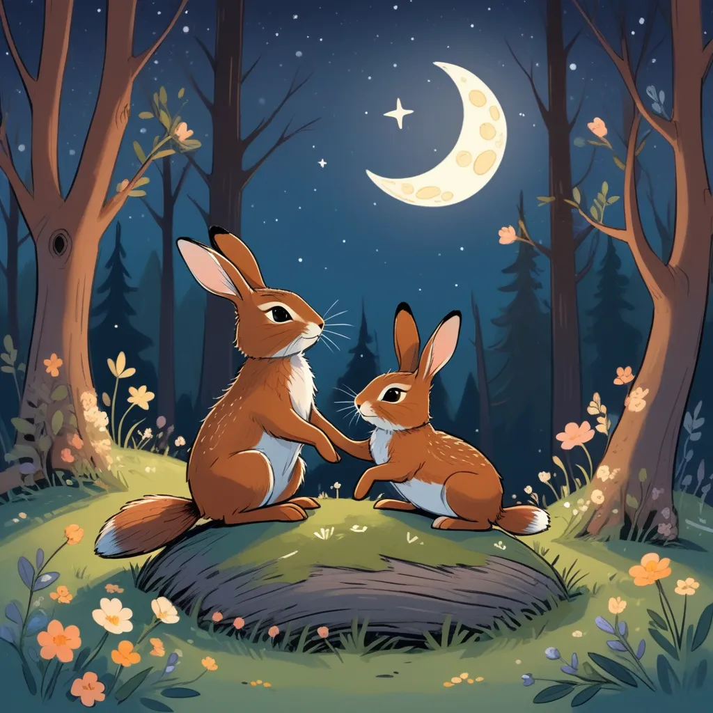 In a cozy burrow nestled beneath the towering trees of a peaceful forest, lived Little Nutbrown Hare. The burrow was warm and snug, filled with soft, mossy nests and dried flowers hanging from the ceiling. The sun had just set, draping the sky in a blanket of twilight hues.