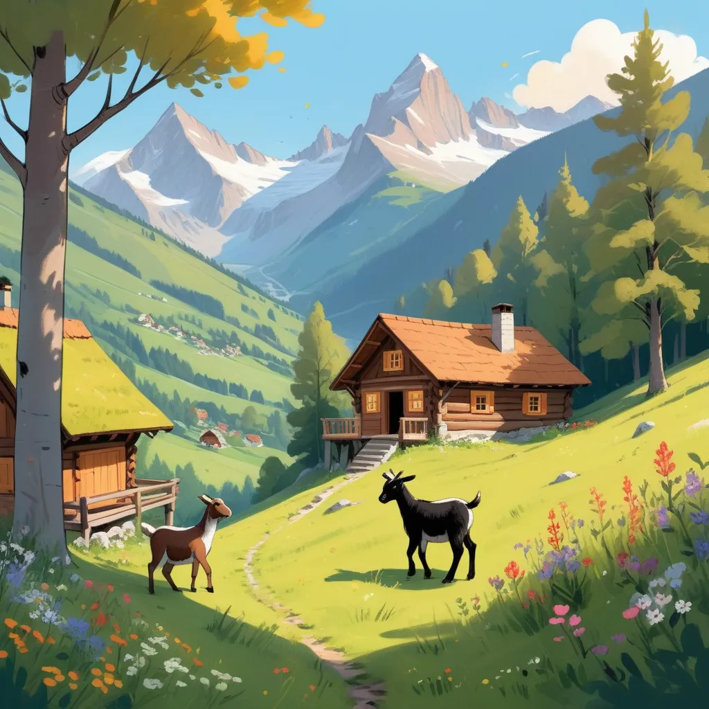 High in the Swiss Alps, nestled amidst green meadows and towering fir trees, there was a cozy little wooden cabin. Here lived a kind but gruff old man named Grandfather with his beloved goats. The cabin was filled with simple comforts—a warm hearth, a sturdy table, and a tiny bed made of soft, cloud-like hay. One sunny morning, the mountains echoed with the cheerful sound of footsteps.
