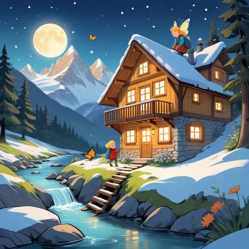 One starry night, as Heidi gazed at the sky filled with twinkling lights, she heard a gentle rustling in the trees. She quickly turned to see a shimmering figure gliding toward her. It was a guardian spirit of the mountains, with wings made of soft, glowing feathers.