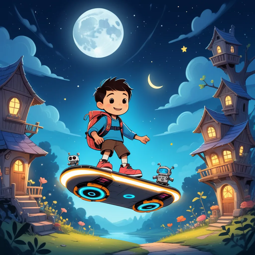 One peaceful evening, the moonlight streamed through the window, casting an eerie silver glow over Shane's workbench. Shane was deep in thought, staring at a sketch of his latest idea—a magical hoverboard that could float above the ground! He had always dreamed of inventing something that would let people fly through the air effortlessly.