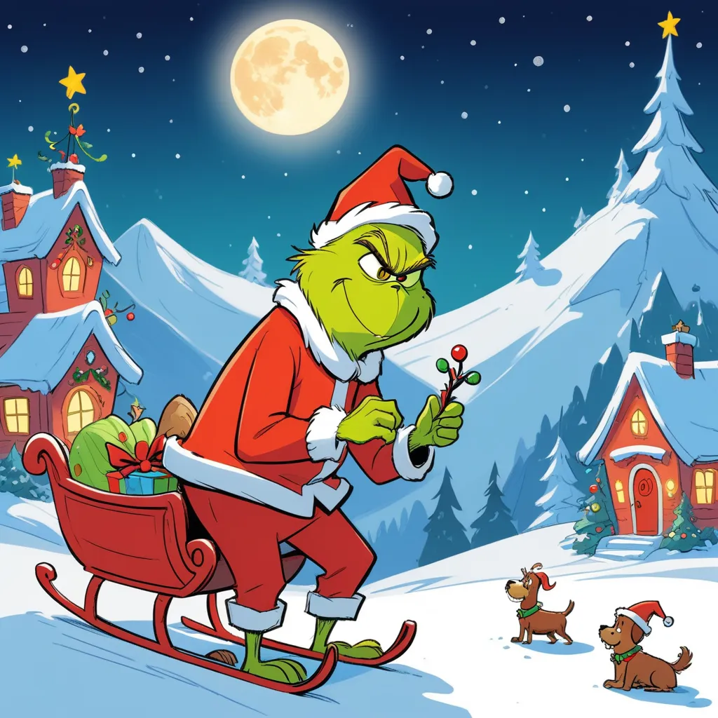On a snowy, moonlit mountaintop overlooking the cheerful town of Whoville, lived a grumpy creature known as the Grinch. His cave was filled with odds and ends, broken gadgets, and discarded toys. The Grinch despised the joy and laughter that floated up from Whoville, especially during Christmas.