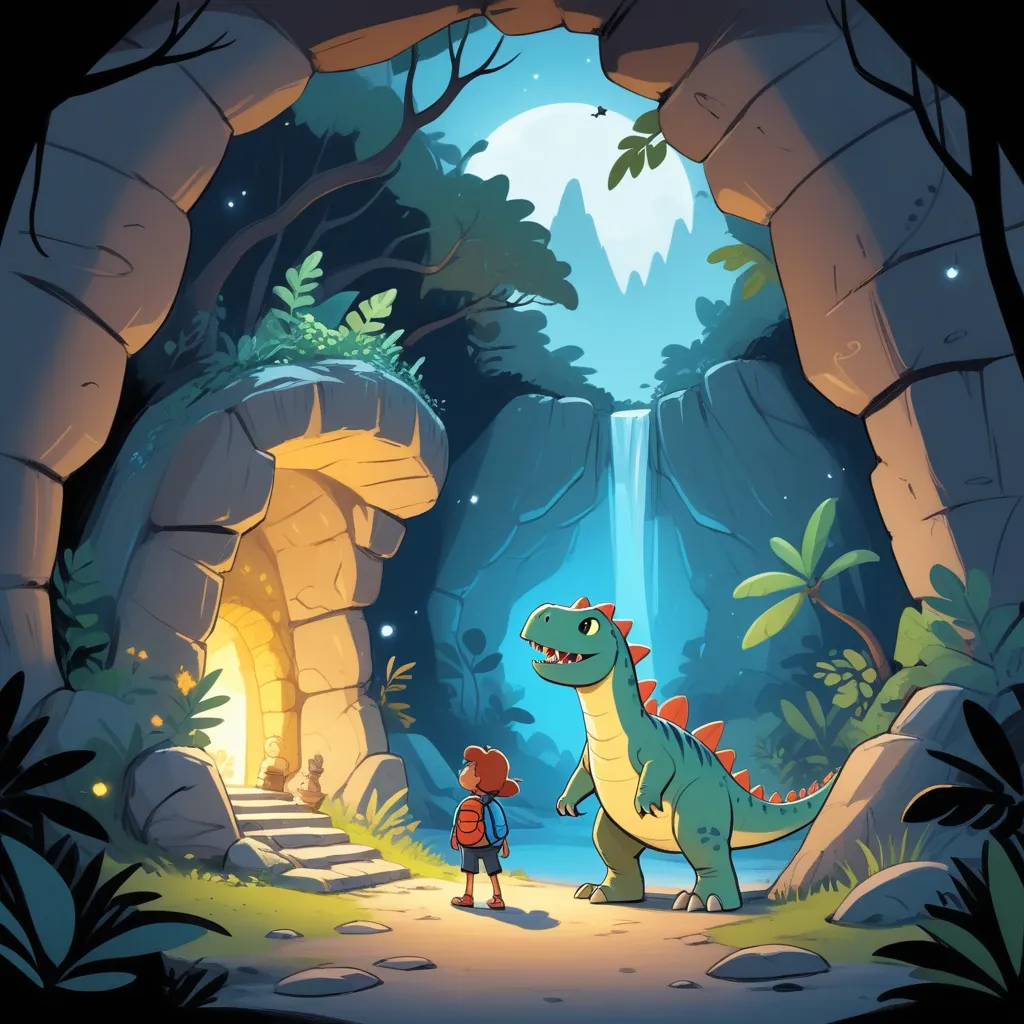 In a cozy little town nestled between the whispering forest and the sparkling river, there was a special place called DinoLand. It wasn’t an ordinary park; it was an enchanted spot where dinosaurs from long ago would sometimes appear, just for a night, to share their stories. In one cozy corner of DinoLand, a mysterious, thick vine-covered entrance to a cave could be found.