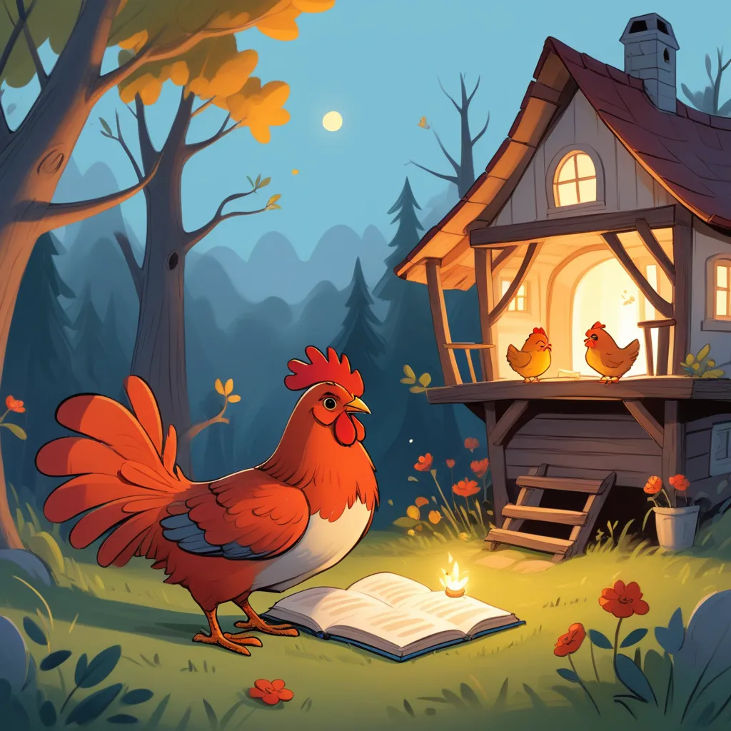Once upon a time, in a cozy, slightly creaky farmhouse, lived a little red chicken and her Papa. The sun had set, casting long shadows that danced on the walls of the snug kitchen, where the scent of freshly baked bread lingered.