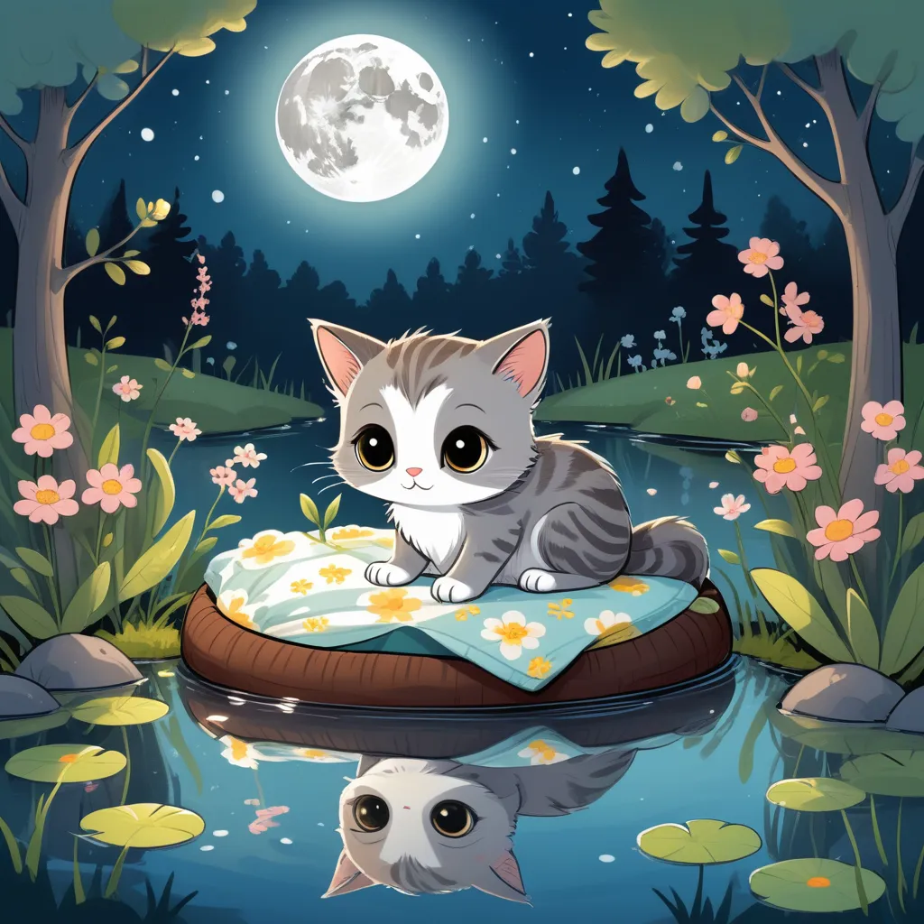 The moon hung high in the sky, casting a silvery glow over a quiet backyard. In the midst of swaying grass and blooming flowers lay a cozy little cat bed on the porch. Inside it curled a small, curious kitten named Lily. Her fur was as soft as cotton, and her eyes sparkled with wonder.