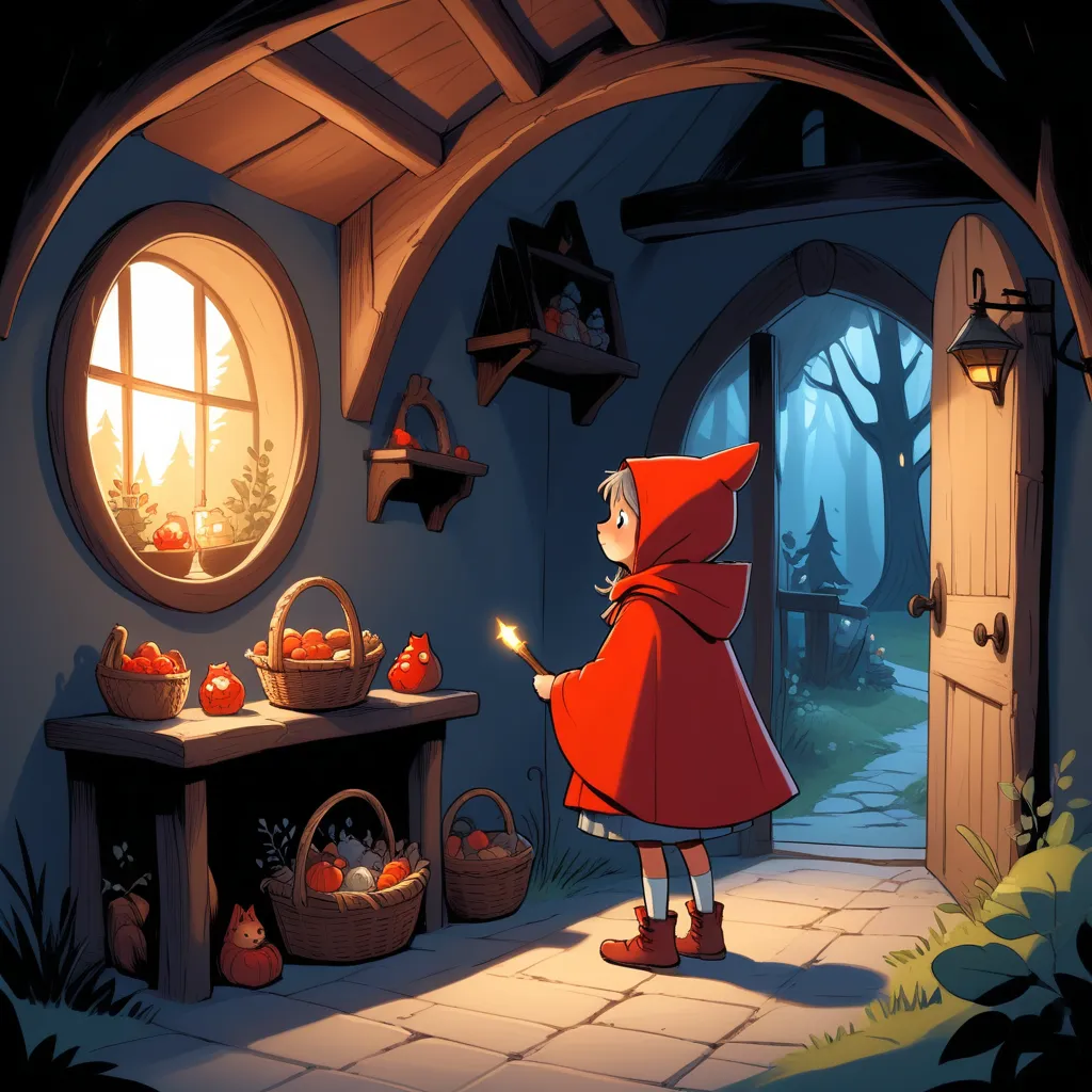 Once upon a time, in a cozy yet forest-edge home, lived a little girl known as Little Red Riding Hood. Her cottage was filled with handmade quilts and tinkling wind chimes, casting a warm but slightly eerie glow from the old lanterns.