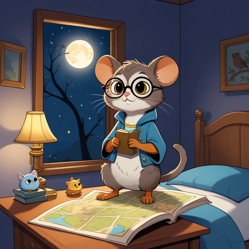 In a cozy yet slightly eerie corner of a child's bedroom, where shadows from moonlight danced on the walls and the stuffed animals seemed to whisper tales of adventure, lived a little mouse named Pip. This wasn’t your ordinary mouse, for Pip had a pair of tiny, gold-rimmed glasses that made him look incredibly wise.