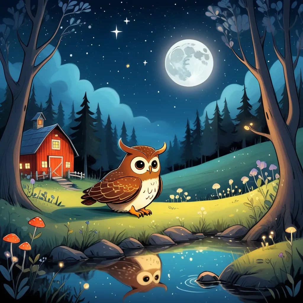In a cozy, dimly lit barn on the edge of Moonlit Meadow, a gentle ox named Oliver stared out at the starry sky through a small window. His straw bed rustled softly beneath him, and the faint glow of fireflies danced around the room. From the rafters hung old lanterns, and a mysterious chest sat in the corner, covered in dust and cobwebs.