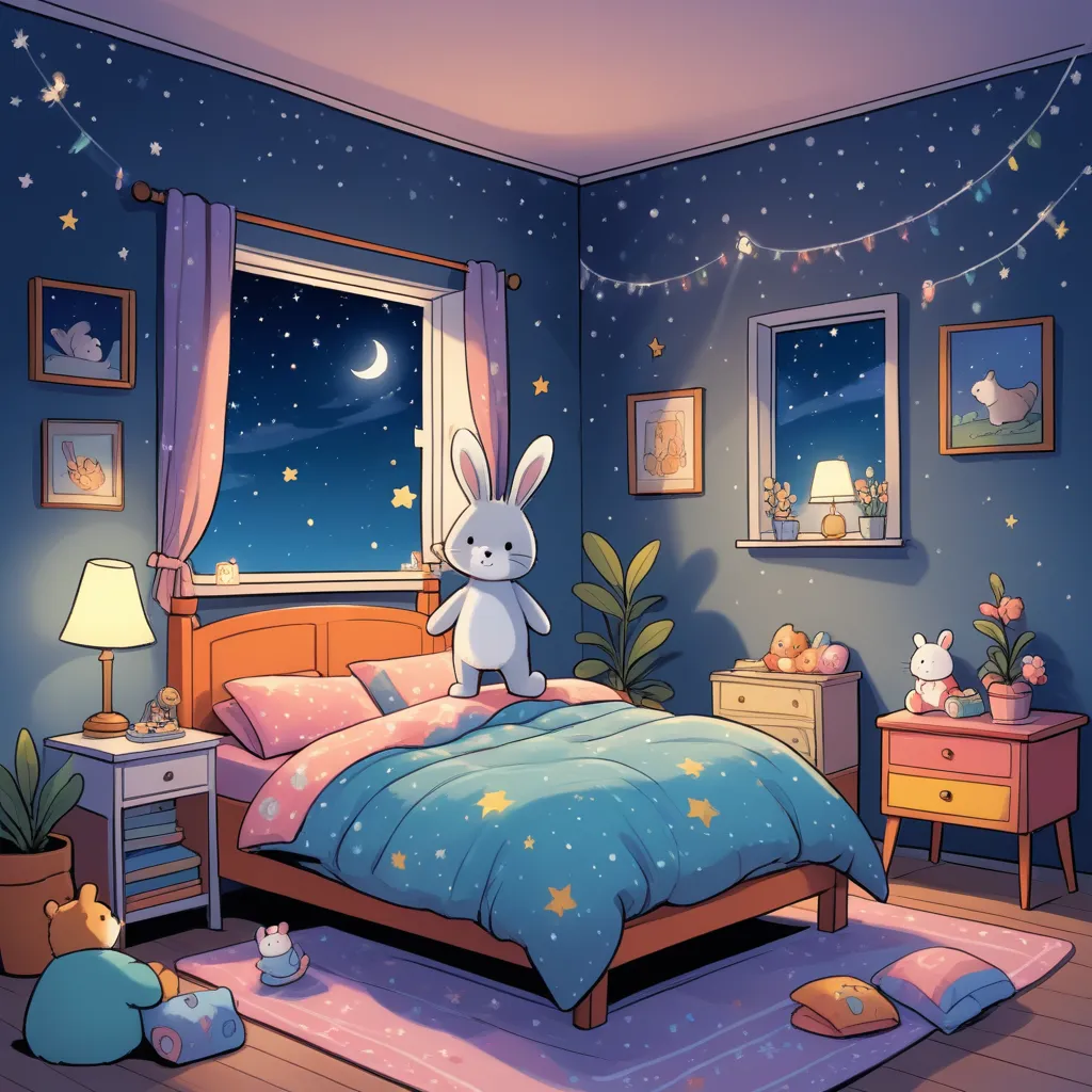 The moonlight filtered through the curtains, casting a soft glow over the cozy bedroom. The room was filled with twinkling fairy lights, piles of colorful pajamas, and a bookshelf lined with bedtime stories. Everything seemed peaceful and ready for sleep, but tonight had a different plan.