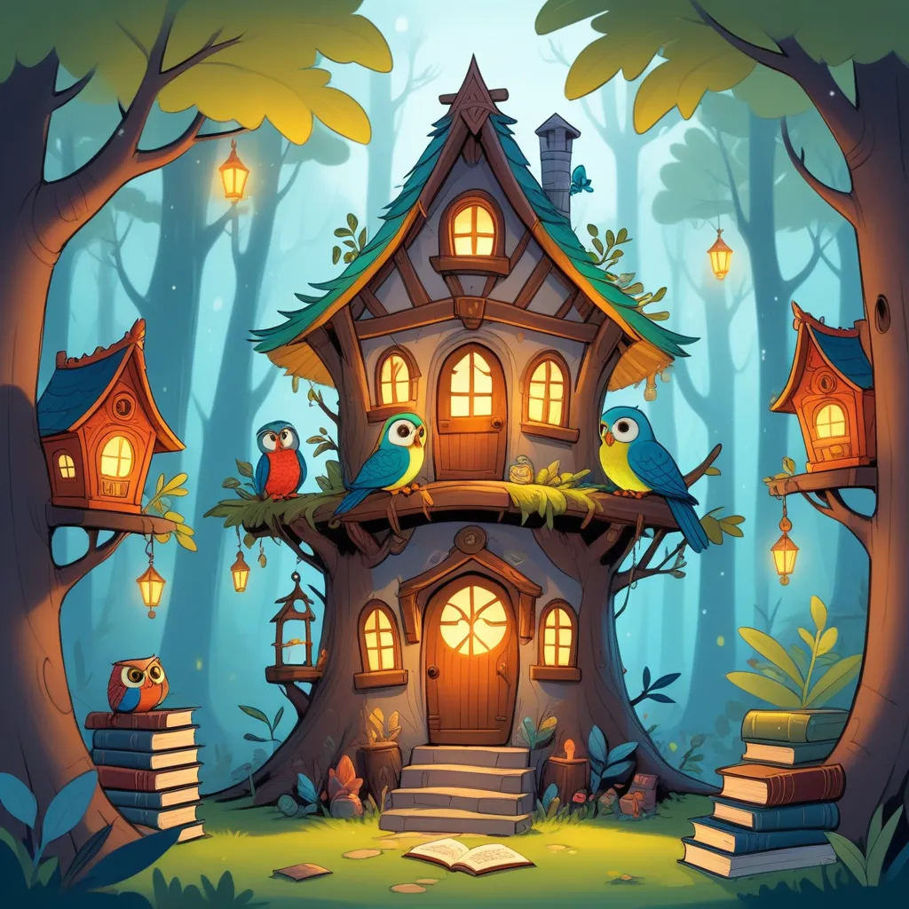 In a cozy little house on the edge of a misty forest, lived a vibrant parrot named Paco. His feathers shone like a rainbow, and he loved to tell stories to his best friend, Emily, a curious little girl with a nose for adventure. Paco's perch was next to a bookshelf filled with old, leather-bound books, and the room was adorned with strange trinkets and maps, giving it a mysterious yet warm feeling.