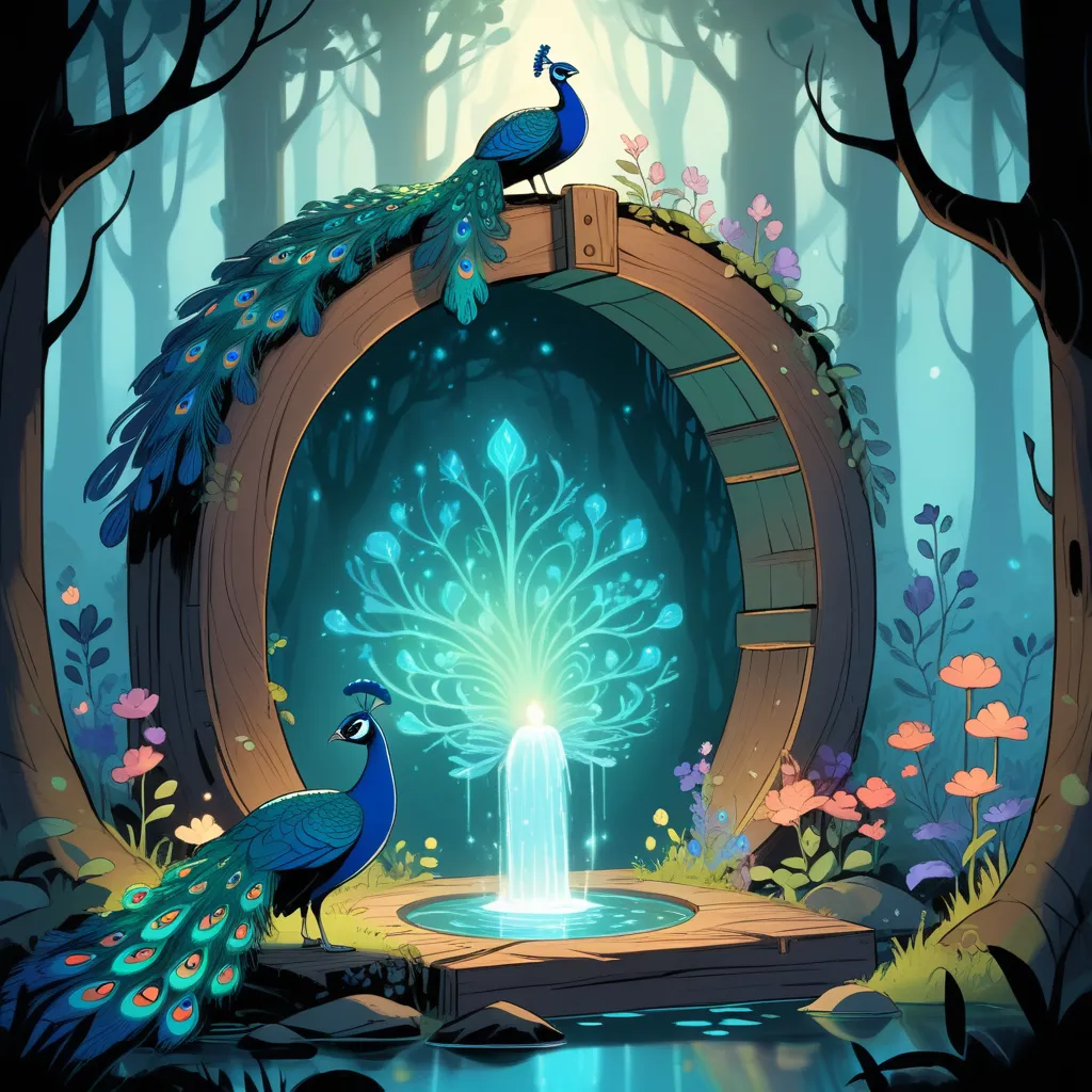 "There it is!" Pavo exclaimed, pointing his beak toward the glowing fountain.