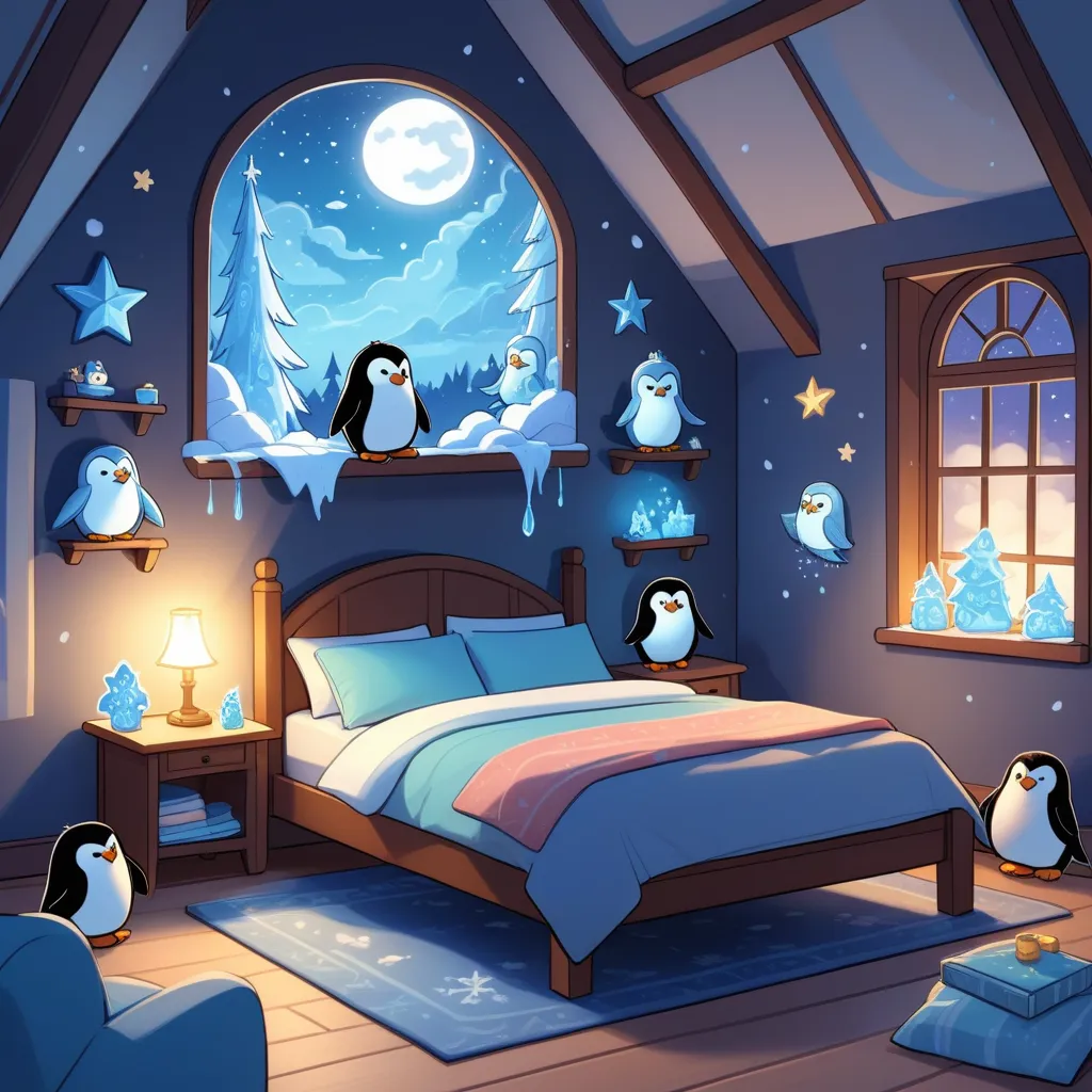 Once upon a time, in a cozy yet slightly eerie room, filled with glowing star stickers and the soft hum of a nightlight, a young boy named Timmy sat on his bed, surrounded by stacks of books and drawings of faraway places. Among the toys and treasures, a small, plush penguin named Percy sat prominently on Timmy's pillow, staring up with button eyes that seemed to glimmer with secrets of their own.