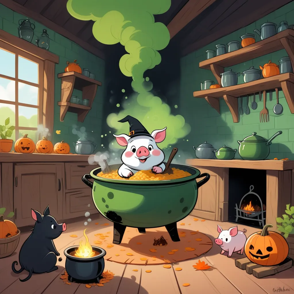From that day on, Gritch traded her witchy ways for a friendly life at the farm, cooking and baking treats with her new friends. And as for Piggy Pie? Well, it became a favorite bedtime story for all the little piggies, each time ending with a good laugh and a happy, safe barnyard.