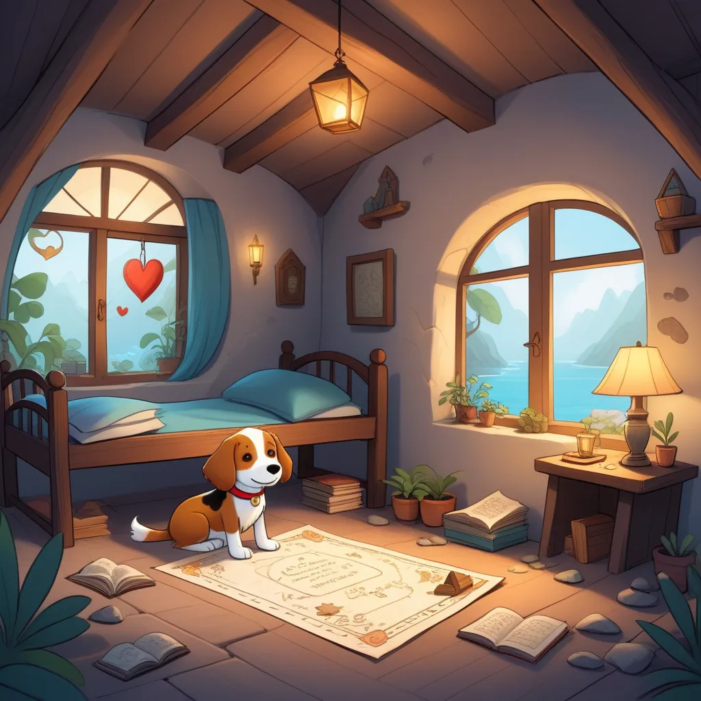 In a snug neighborhood where sunlight danced through the trees, there lived a brave, curious girl named Mia and her best friend, Toby, a cheerful and clever dog. Mia's bedroom was cozy, yet there was a whisper of mystery about it. Old maps hung on the walls, and a dusty chest full of forgotten treasures sat in the corner, waiting to tell their tales.