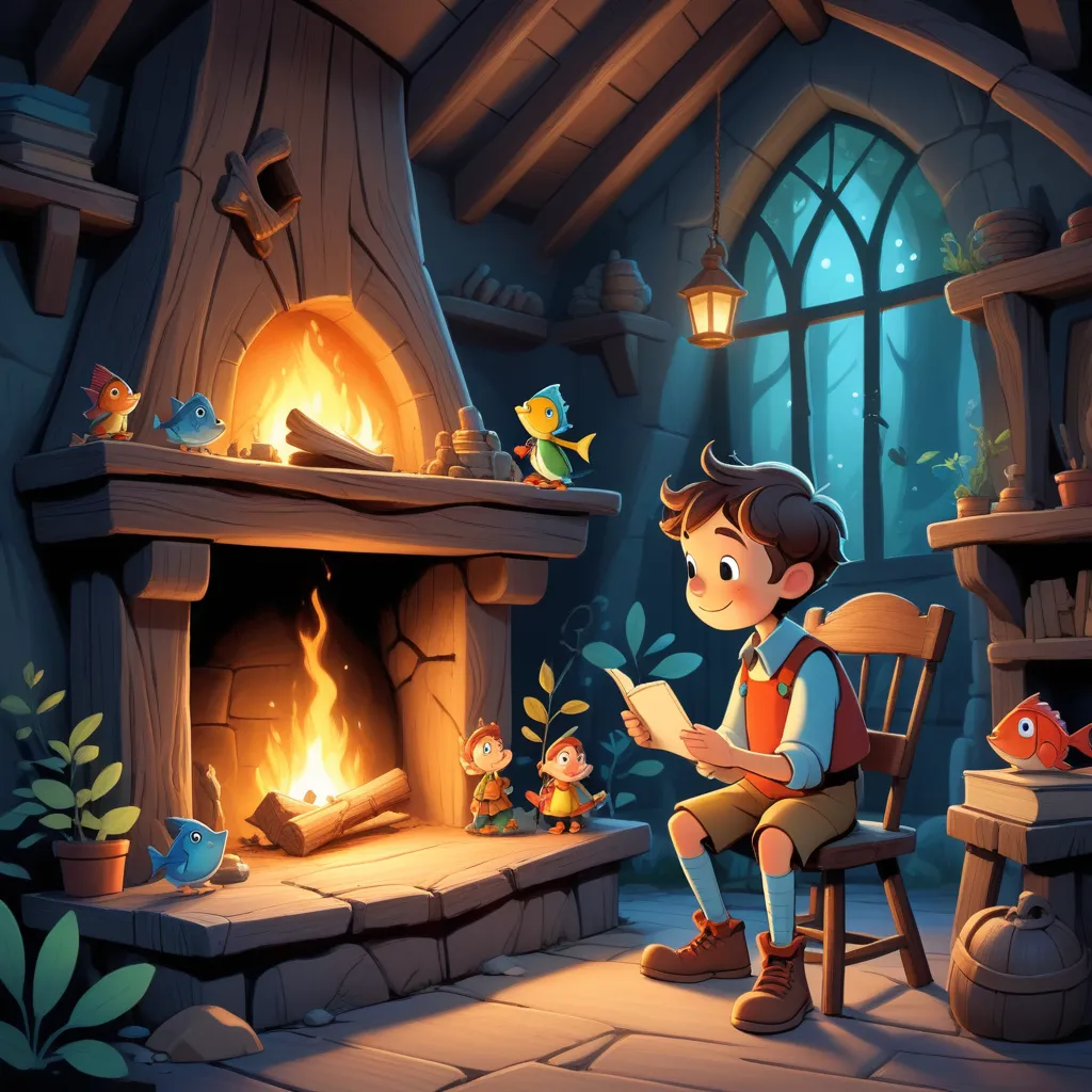 In a cozy little workshop on the edge of a small town, an old woodcarver named Geppetto lived surrounded by shelves filled with tools and wooden toys. His workshop, although cluttered, had a warm, welcoming glow from the fireplace. It was a place where magic seemed possible, and on the quietest of nights, the wooden figures almost felt alive.