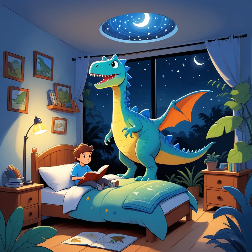 In a cozy, dimly-lit bedroom filled with piles of books, dinosaur toys, and illuminated by a softly glowing nightlight, 8-year-old Liam found himself nestled under a warm blanket, reading his favorite dinosaur adventure book. Beside him, perched on the edge of the bed, was his stuffed T-Rex, Rexy. Leaves rustled softly against the windowpane, creating an eerie but comforting symphony.