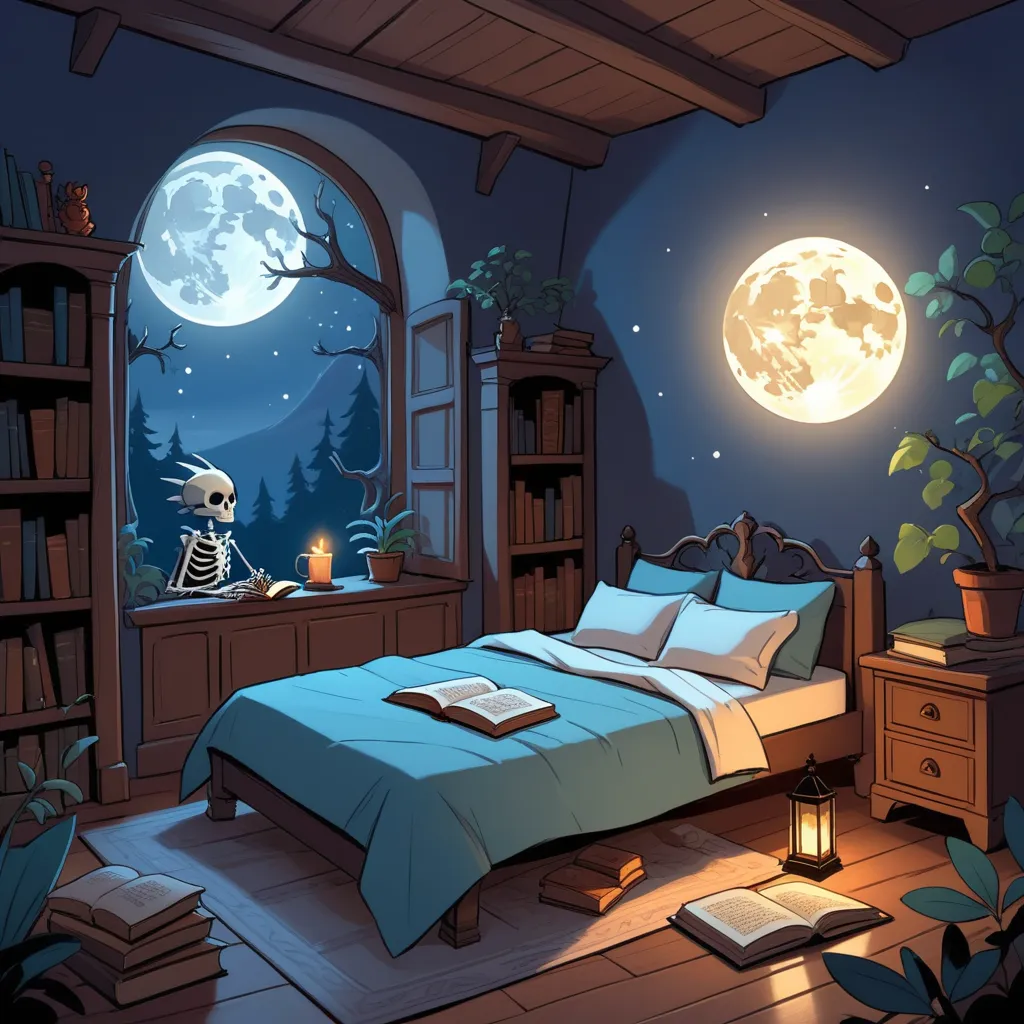 Skelly explained as he sat down on Jacob’s bed, the bones making rattling sounds. "My magic bone has the ability to illuminate hidden pathways in dark places. Without it, I can't find my way back to the Moonlight Castle."