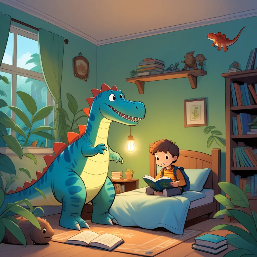One evening, as the shadows danced on the walls, Jack’s eyes fell upon a particularly magnificent dinosaur: the Spinosaurus. "Woah," he whispered in awe, tracing the giant creature's spine with his finger. Just then, a strange, shimmering light appeared by his window, beckoning him closer.