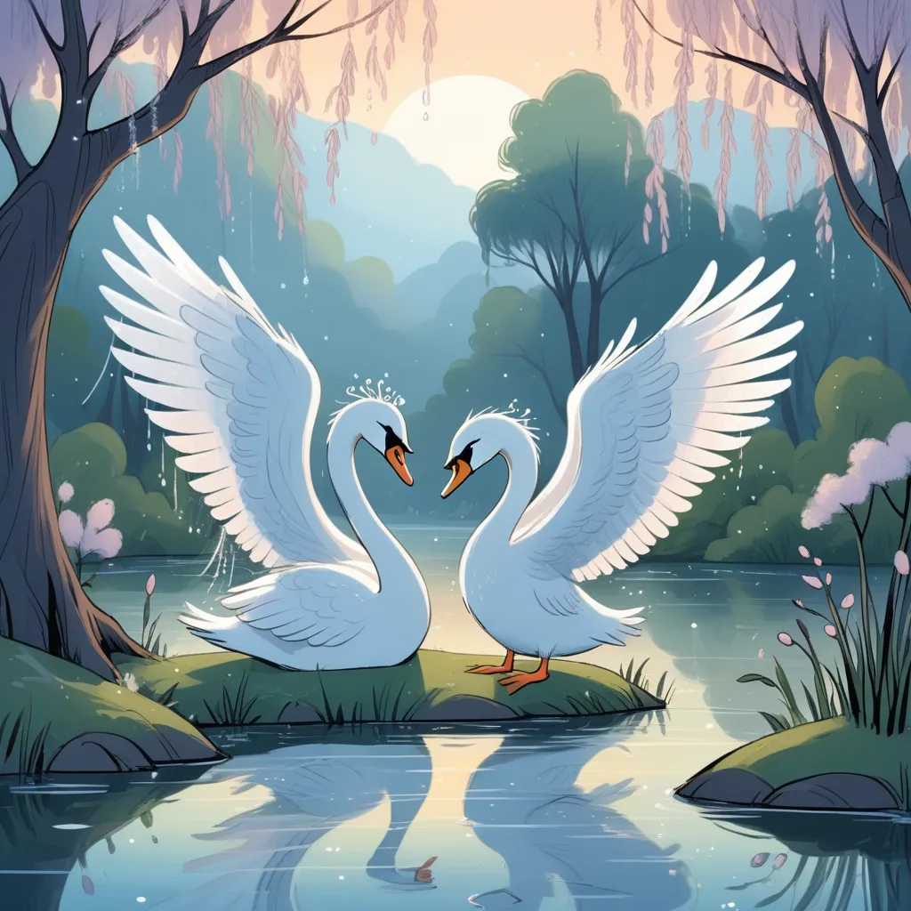 Once upon a time, in a small village nestled by the edge of a misty lake, lived a young swan named Sera. Sera lived in a cozy little nest under a weeping willow that draped its long branches down into the water. The villagers always told tales of strange happenings around the lake, making the setting both enchanting and just a little eerie.