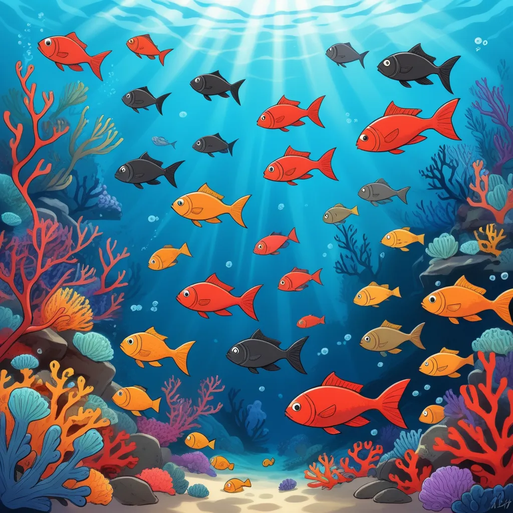 In a vibrant underwater world, among the swaying sea grasses and colorful corals, lived a little black fish named Swimmy. Swimmy wore the deepest shade of midnight, which made him stand out from his bright red brothers and sisters. Life was peaceful in their sheltered corner of the ocean, where they played and darted safely through the waters.