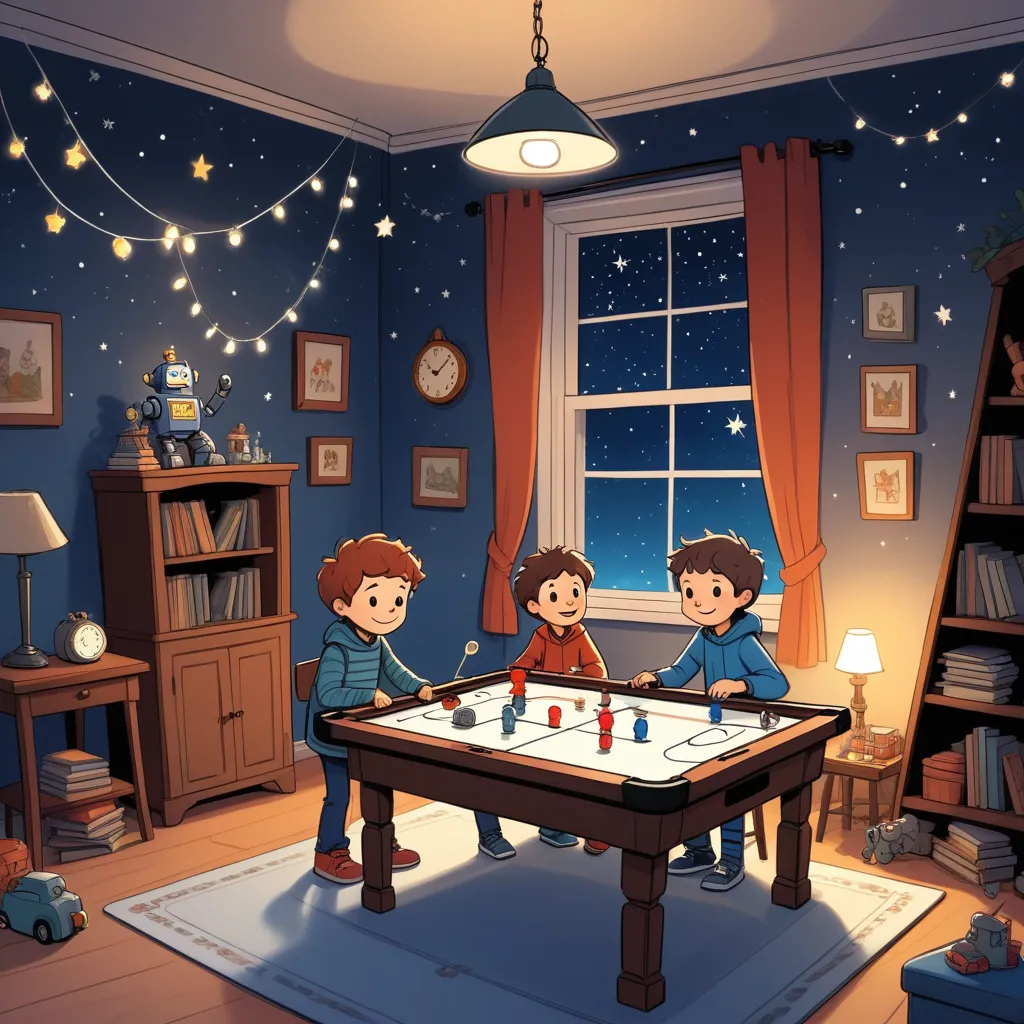 Tommy's eyes widened with excitement. He had always loved playing hockey in the yard, but this table was a whole new adventure. Just as he reached to touch one of the tiny players, a voice piped up, startling him. It was his friend and secret lieutenant, a toy robot named Robby, which Tommy had built from an old erector set.