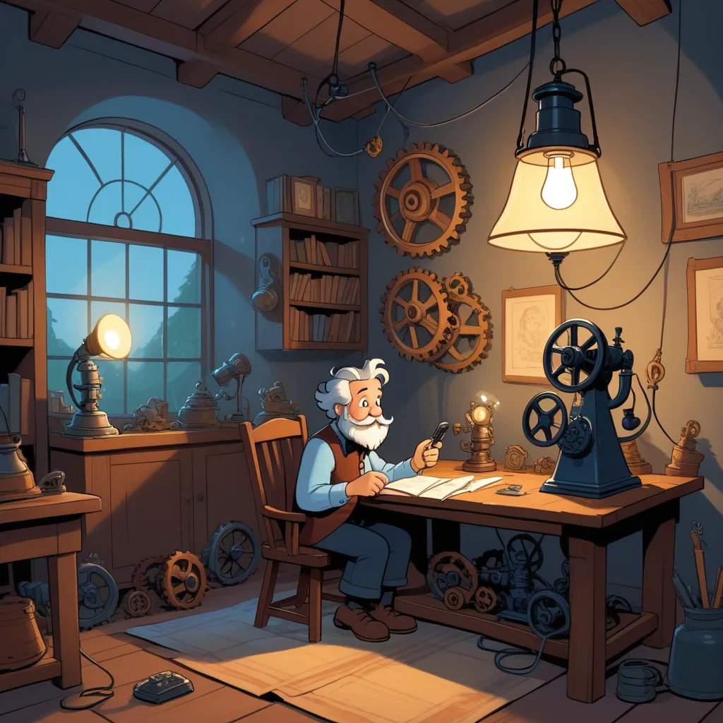 In a cozy yet slightly eerie workshop filled with gears, wires, and strange contraptions, there lived a curious inventor named Alexander Graham Bell. Outside, the wind howled around the corners of the old brick building, adding an air of mystery to the place.