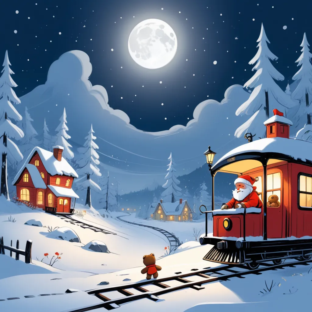 On a snowy Christmas Eve, young Evan snuggled into his warm bed, with the soft glow of his moon-shaped nightlight casting a faint shimmer on the walls. All around him were beloved objects: a map of the world, a model train set, and a worn-out teddy bear named Oliver. The room felt cozy, yet the silence of the night carried a mysterious, magical tinge.