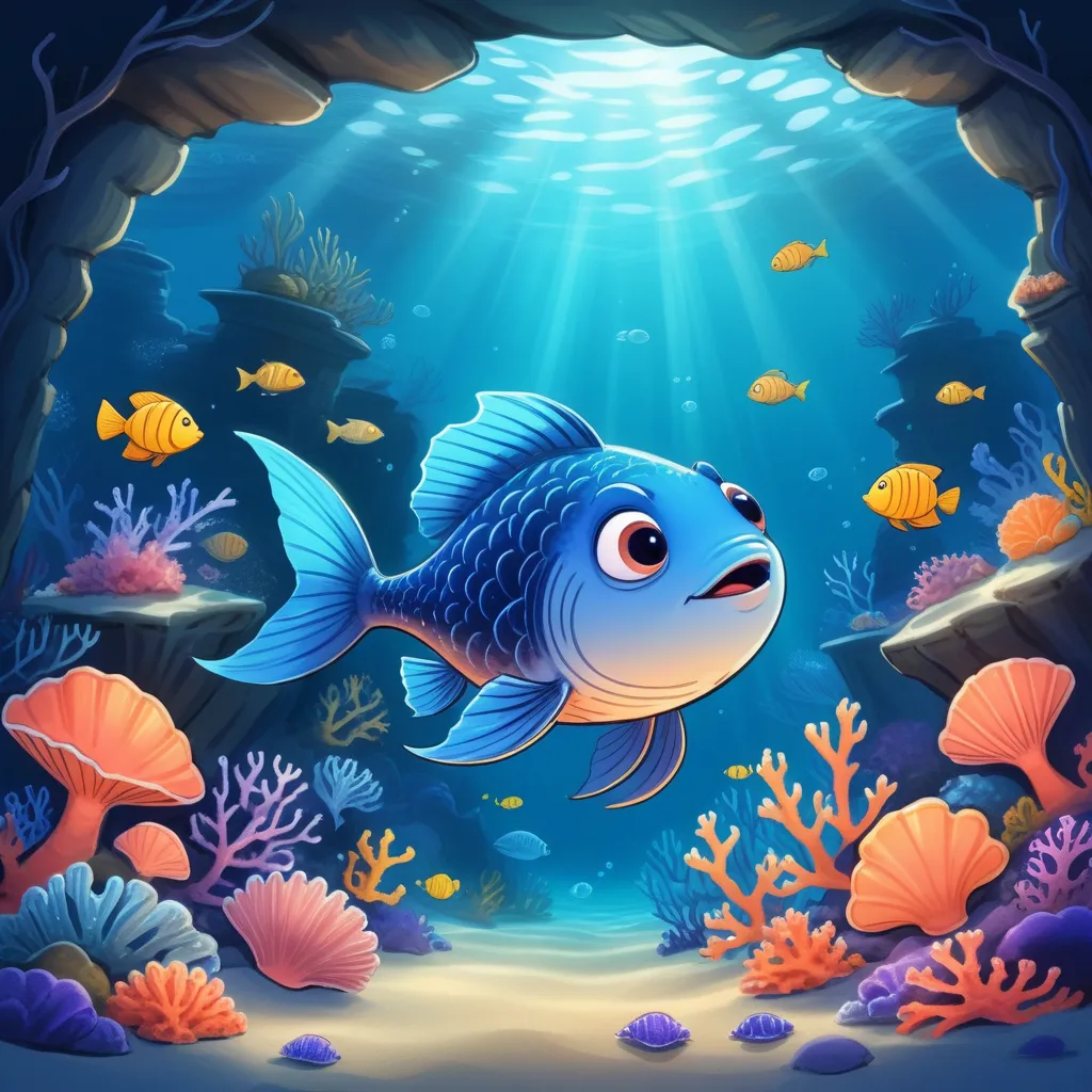 Deep in the shimmering waters of the big blue sea lived a fish named Mr. Fish. His head was always hung low, and his lips were perpetually in a pout. No matter how much the ocean sparkled around him, Mr. Fish—well, he just couldn't help but feel glum.