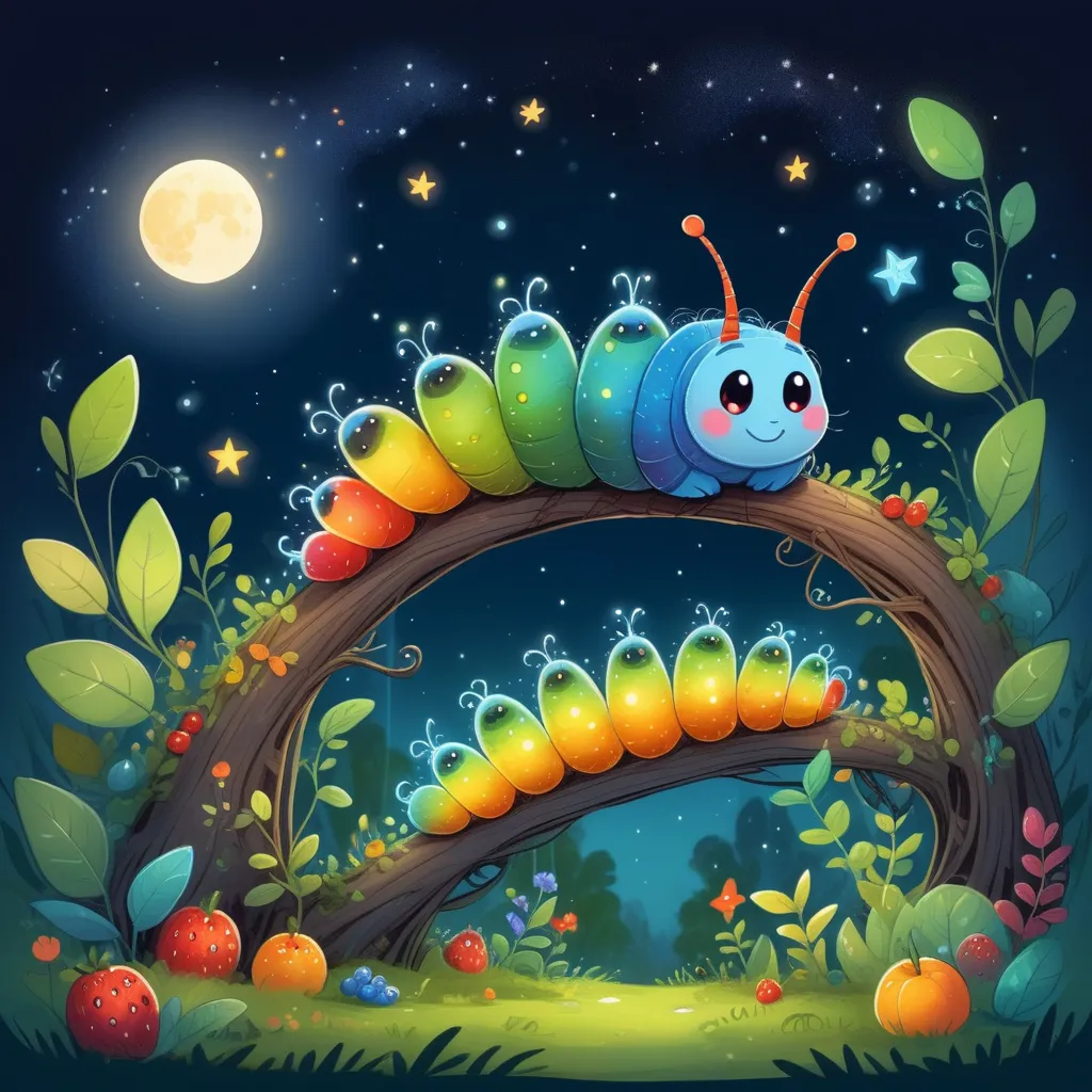 Once upon a time, in a garden lit by the gentle glow of fireflies, beneath twinkling stars, there lived a very hungry caterpillar named Charley. Charley was not just any caterpillar—he had rainbow stripes that shimmered under the moonlight.